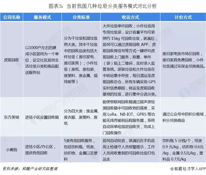 當(dāng)前市場(chǎng)上垃圾分類服務(wù)主要集中在智能垃圾回收方面,垃圾回收系統(tǒng)記錄用戶姓名、積分、聯(lián)系方式、回收記錄等,用戶用積分兌換物品,實(shí)現(xiàn)源頭的可回收垃圾分揀。小黃狗主要面向用戶端,有償回收,經(jīng)再生資源處理后再販賣?;⒏缁厥談t綜合了垃圾收運(yùn)、分類、資源化、采取政府購買服務(wù)方式。